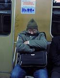 Жанровая фотография. Спящий мужчина в вагоне поезда метро.