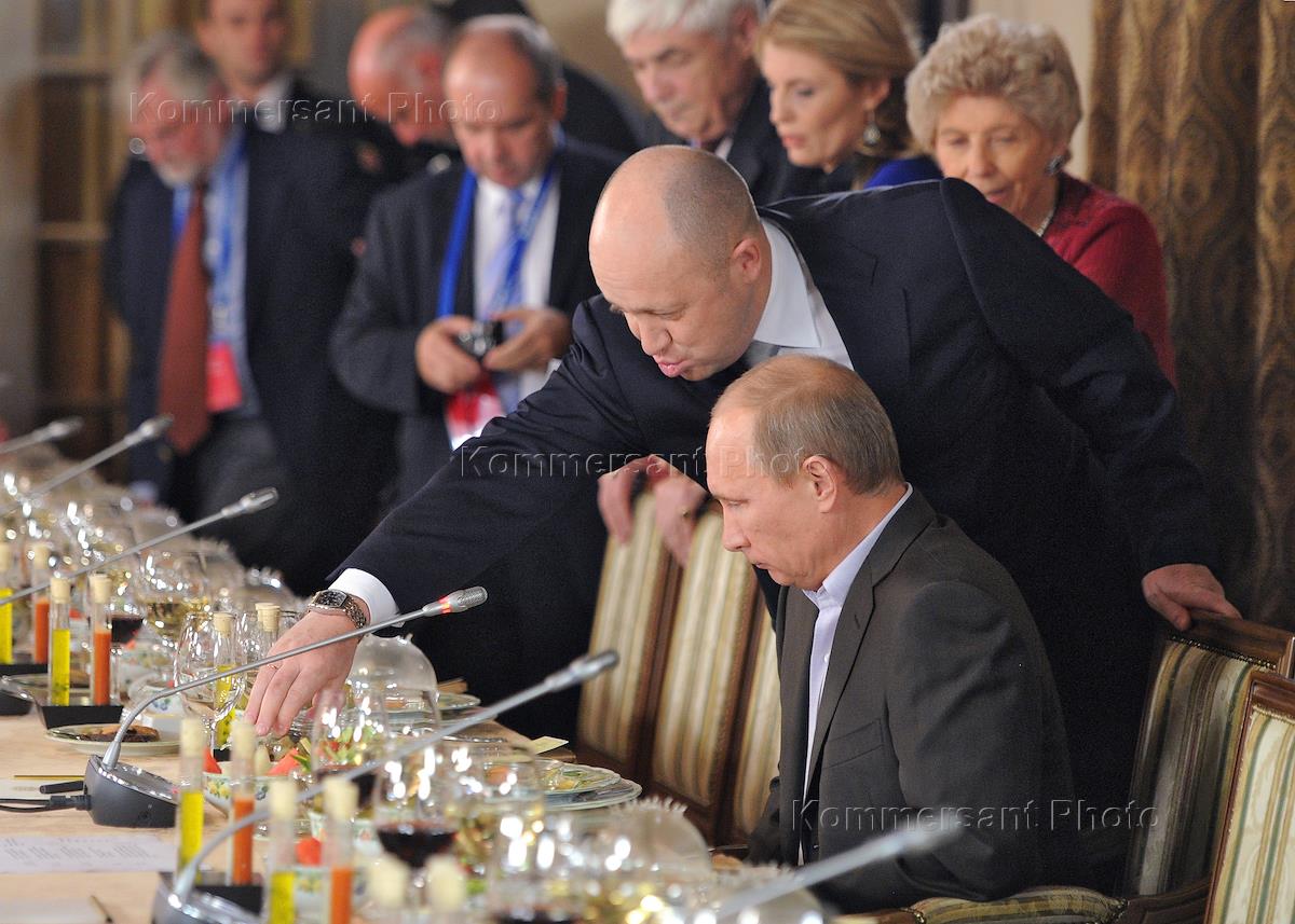 Russian Prime Minister Vladimir Putin (left) and Concord director Yevgeny Prigozhin (right) during a meeting with members of the Valdai International Discussion Club.