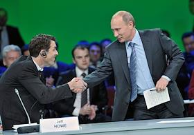 Писатель, профессор журналистики в университете Northeastern, научный сотрудник Гарвардского университета Джефф Хауи (слева) и председатель правительства России Владимир Путин (справа) на Международной финансовой конференции "Новые технологии управления. Что изменит мир?", приуроченной к 170-летия Сбербанка России. Конференция прошла в Гостином дворе.
