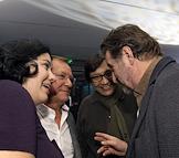 Актер Сергей Шакуров (второй слева) с супругой Екатериной Бабаловой (слева), режиссер Егор Кончаловский (второй справа) и актер Леонид Ярмольник (справа) на презентации первого номера журнала "Baku" и открытии выставки британских фотохудожников Тома Крейга и Джайлса Прайса в Мультимедиа Арт Музее.