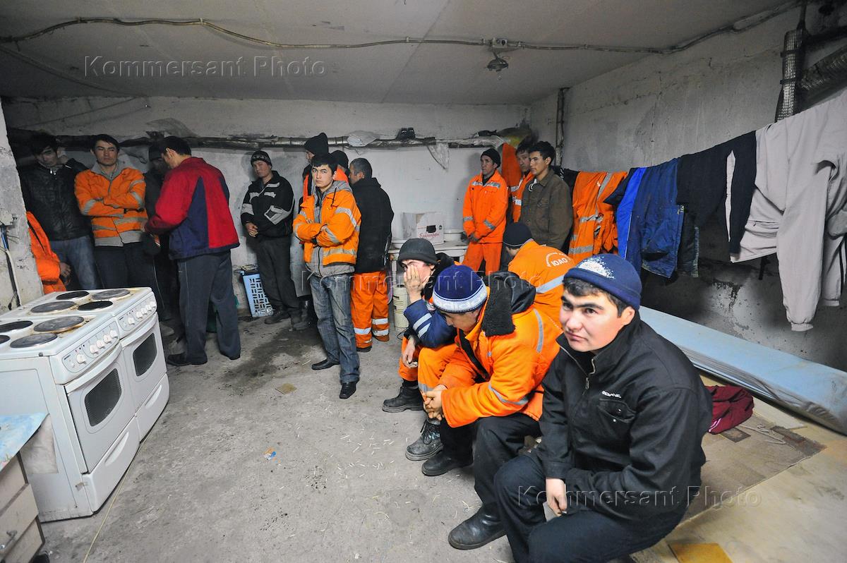 Граждане Таджикистана в местах нелегального проживания во время совместного рейда по проверке документов активистов движения "Светлая Русь" с полицией города.