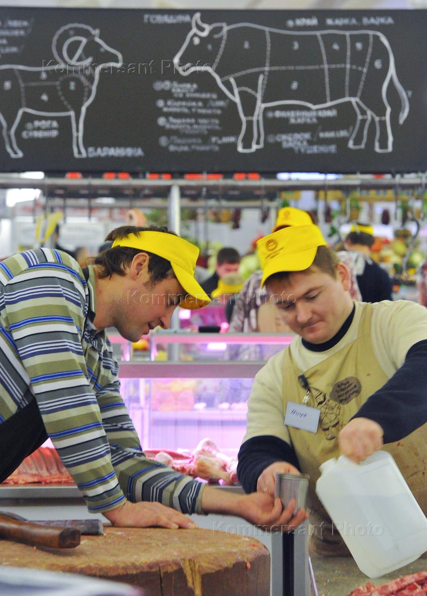 Покупатель с собакой у мясного ряда на Даниловском рынке.