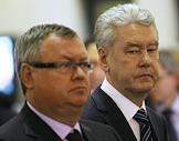 Президент, председатель правления "Внешторгбанка" Андрей Костин (слева) и мэр Москвы Сергей Собянин (справа) во время VIII Дня Банкира, организованного деловым еженедельником "Итоги" и Международным рейтинговым агентством Fitch Ratings совместно с Российским союзом промышленников и предпринимателей. Бал прошел в отеле "Балчуг Кемпински Москва".