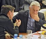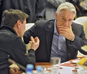 Тренер по хоккею Вячеслав Быков (слева) и главным тренером сборной России по хоккею Зинэтула Билялетдинов (справа) во время встречи председателя правительства России Владимира Путина с руководством российского хоккея. Встреча прошла во Двореце спорта "Мегаспорт" на Ходынском поле.