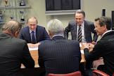 Первый заместитель председателя комитета Государственной думы России по физической культуре и спорту, президент Федерации хоккея России Владислав Третьяк (слева), главным тренером сборной России по хоккею Зинэтула Билялетдинов (в центре), министр спорта, туризма и молодежной политики России Виталий Мутко (второй справа) и тренер по хоккею Вячеслав Быков (справа) во время встречи председателя правительства России Владимира Путина (второй слева) с руководством российского хоккея. Встреча прошла во Двореце спорта "Мегаспорт" на Ходынском поле.