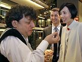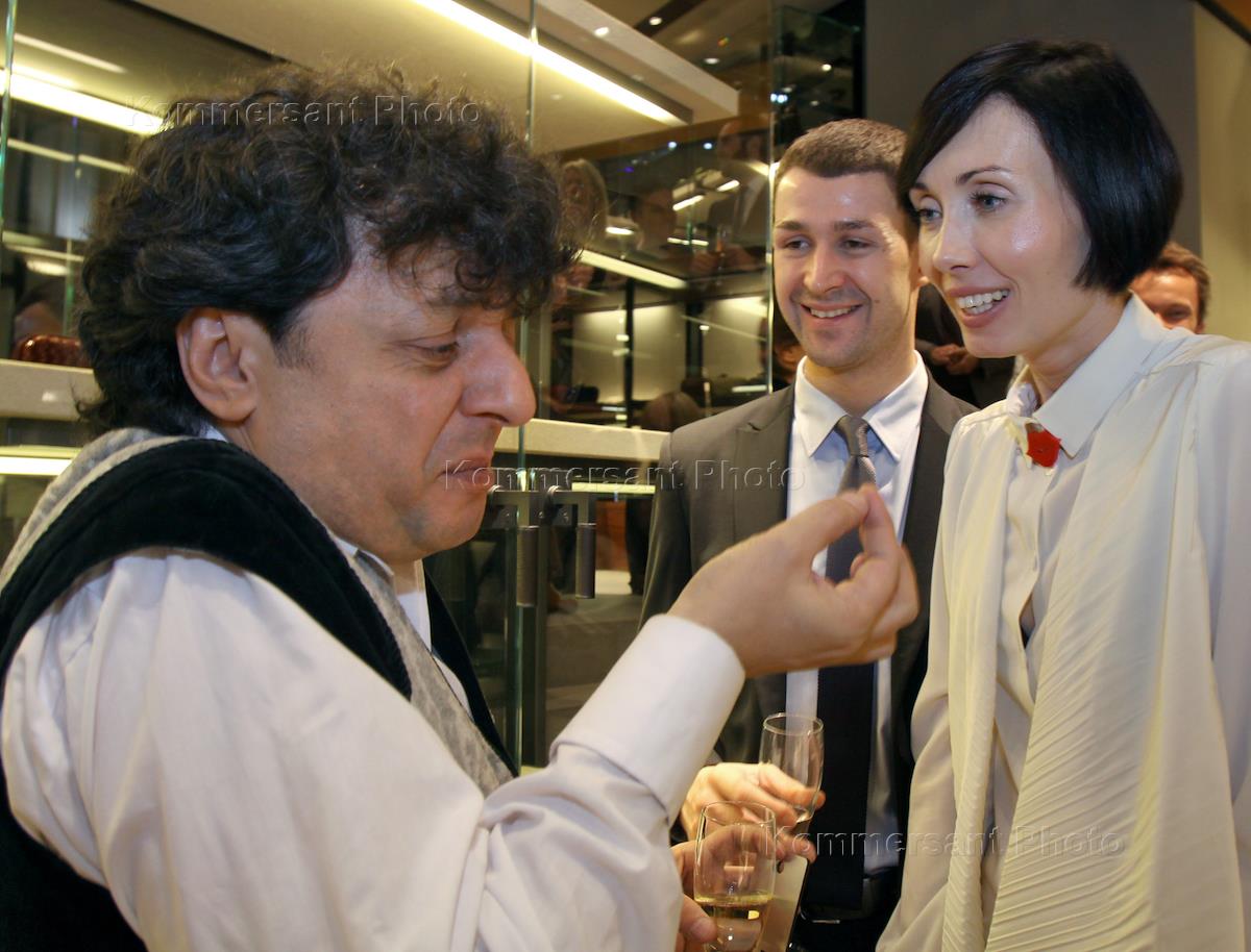 Художник Армен Ерицян (слева) и телеведущая Мария Железнякова (справа) на выставке "Knot: Retrospective", приуроченой к десятилетию работы Томаса Майера как креативного директора Bottega Veneta. Выставка прошла в бутике Bottega Veneta в Третьяковском проезде.