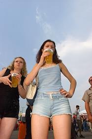 Девушки пьют пиво из пластиковых стаканов на церемонии открытия Четвертого фестиваля пива. Церемония прошла на территории спортивного комплекса "Лужники".
