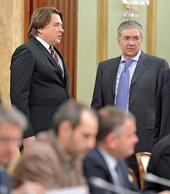 Президент ООО "Проф-Медиа Менеджмент" Рафаэль Акопов (слева) и заместитель председателя правительства России, президент Олимпийского комитета России Александр Жуков (справа) перед началом заседания правительственного совета по развитию отечественной кинематографии.