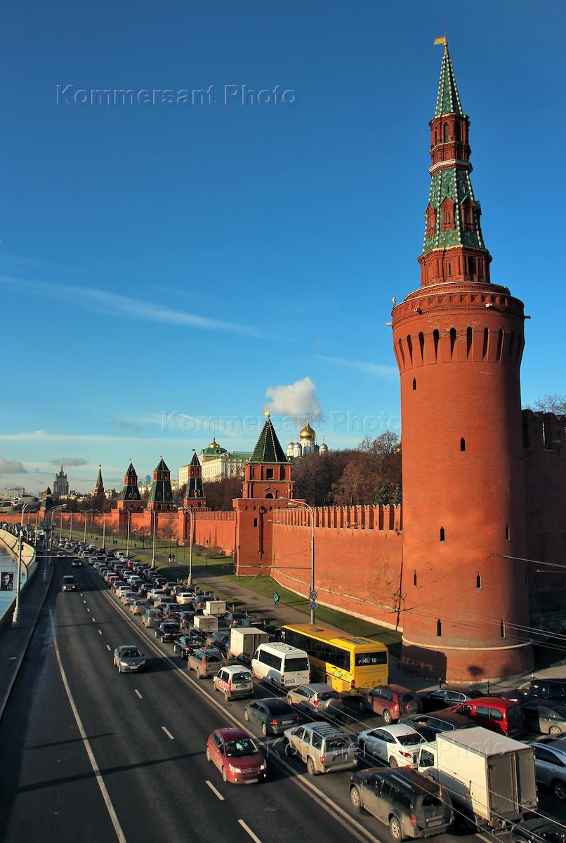 Вид с Большого Каменного моста на Кремль. Автомобильная пробка на Кремлевской набережной.