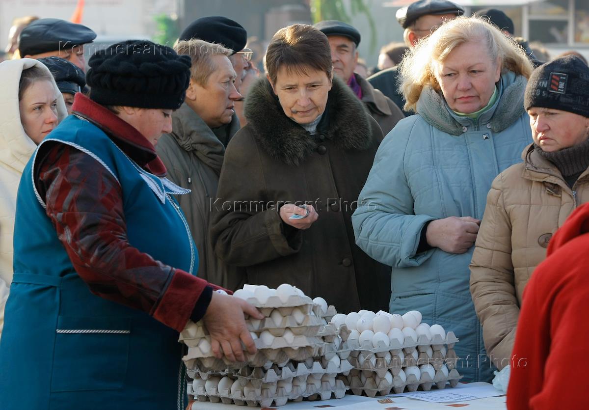Жанровая фотография. Покупатели в очереди за покупкой яиц.