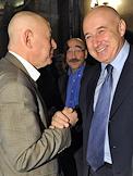 Писатель-сатирик Михаил Жванецкий (слева) и режиссер Владимир Наумов (справа) перед заседанием Круглого стола, посвященного открытию выставки "Караваджо (1571-1610)", в посольстве Италии.