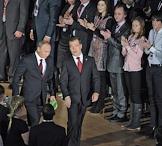 Президент России Дмитрий Медведев (в центре), председатель правительства России Владимир Путин (слева) и директор Московского НИИ неотложной детской хирургии и травматологии Леонид Рошаль (справа) на XII Съезде Всероссийской политической партии "Единая Россия" на Малой спортивной арене спорткомплекса "Лужники".