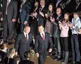 Президент России Дмитрий Медведев (в центре), председатель правительства России Владимир Путин (слева) и директор Московского НИИ неотложной детской хирургии и травматологии Леонид Рошаль (справа) на XII Съезде Всероссийской политической партии "Единая Россия" на Малой спортивной арене спорткомплекса "Лужники".