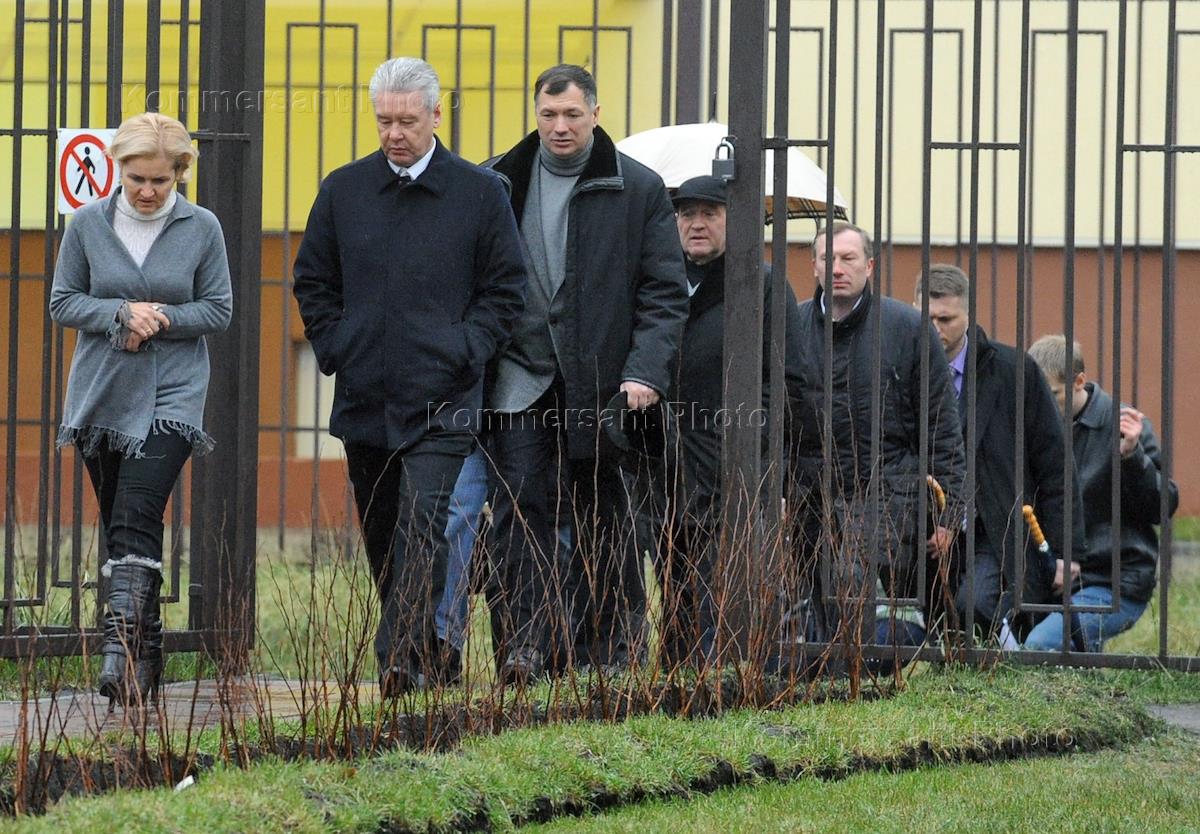 Мэр Москвы Сергей Собянин (второй слева) после посещения нового здания школы № 1830 в первом микрорайоне поселка Некрасовка Юго-Восточного административного округа города Москвы.