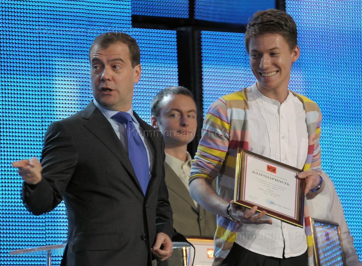 Президент России Дмитрий Медведев (слева) и исполнительный директор ООО "Банкет-сервис" Кирилл Брук (справа) на церемонии вручения благодарностей президента России "За активную жизненную позицию и общественную деятельность на благо России". Церемония прошла в клубе "Арена Moscow".