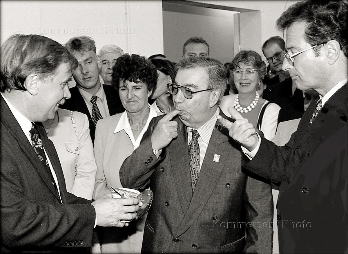 Russian Prime Minister Yevgeny Primakov (center) at the opening ceremony of the Alpen Gold chocolate factory.