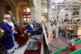 Жанровая фотография. Выступление оркестра в новогодних костюмах Деда Мороза в Главном универсальном магазине (ГУМ).