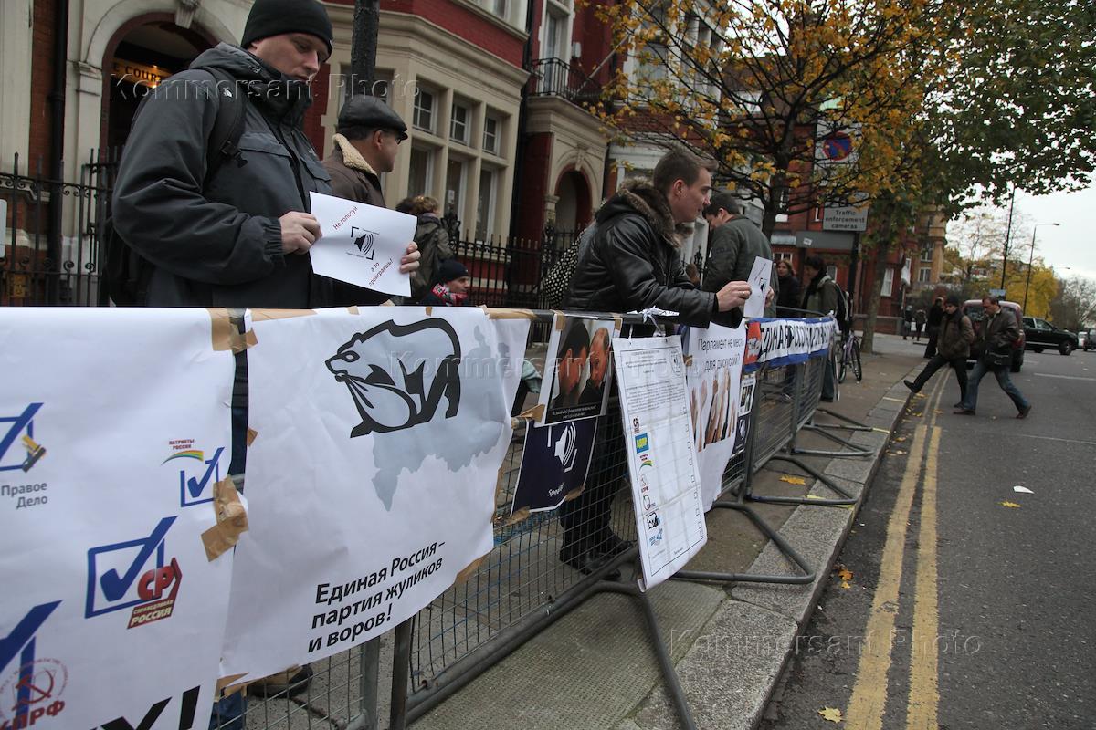 Выборы депутатов Государственной думы России шестого созыва. Пикет противников выборов у избирательного участка, который был открыт в посольстве России в Лондоне.