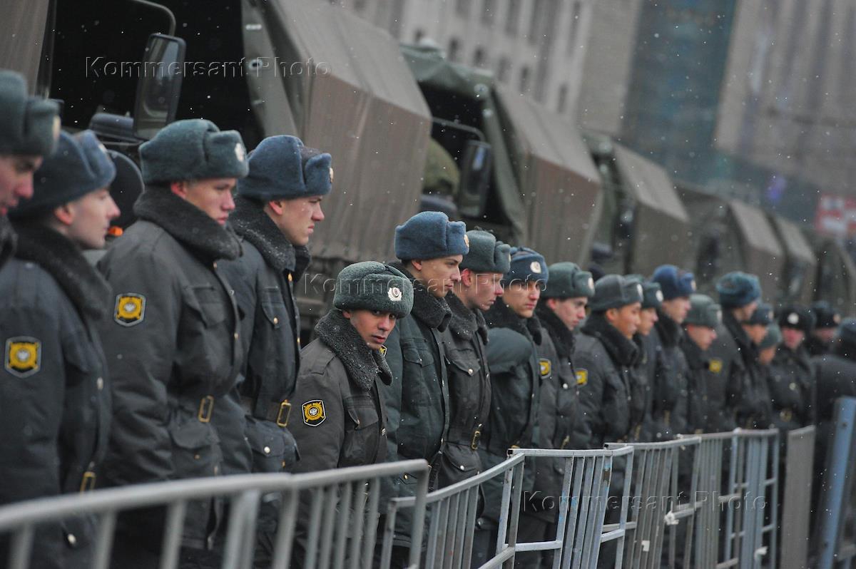 Усиление мер безопасности в центре Москвы в связи с акцией оппозиции "За честные выборы". Сотрудники правоохранительных органов на площади Революции.