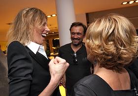 Главный редактор журнала "Hello!" Светлана Бондарчук (слева) на открытии фотовыставки французского актера Венсана Переса (в центре) "От Владивостока до Парижа". Выставка прошла в галерее RuArts.