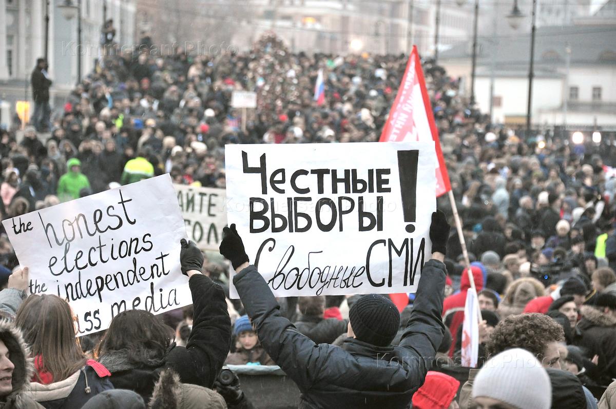 Участники митинга оппозиции. Митинг под лозунгом "За честные выборы" прошел на Болотной площади. Плакат "Честные выборы! Свободные СМИ!"