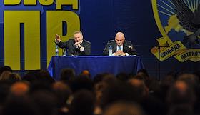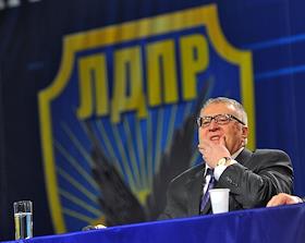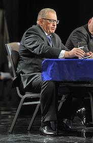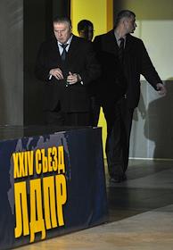 Лидер Либерально-демократической партии России (ЛДПР) Владимир Жириновский (слева) во время ХХIV съезда ЛДПР, на котором состоялось выдвижение кандидата на должность президента России от ЛДПР. Съезд прошел в "Форум Холле на Павелецкой".
