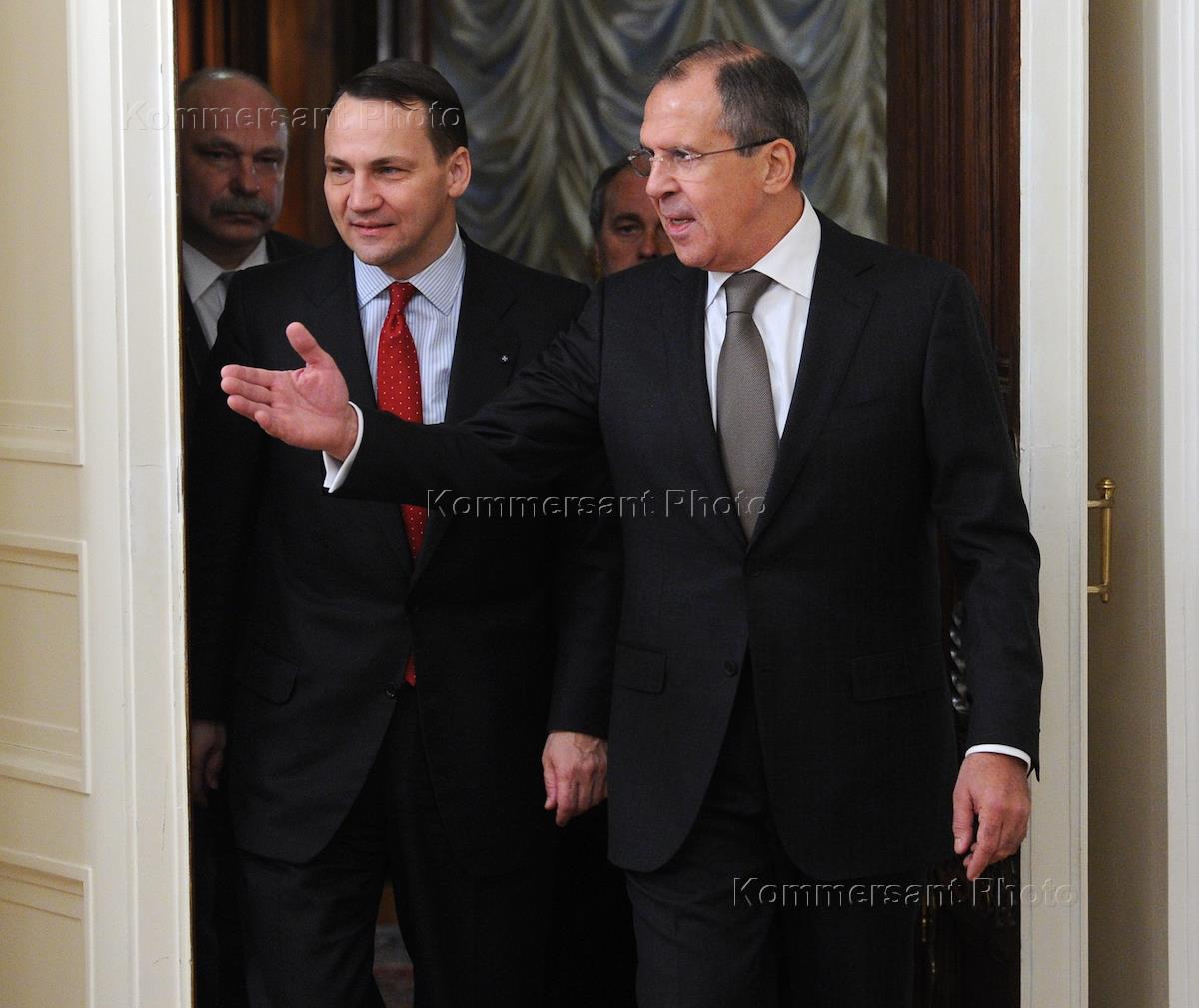 Министр иностранных дел Польши Радослав Сикорский (второй слева) и министр иностранных дел России Сергей Лавров (справа) во время официальной встречи в Доме приемов МИД.