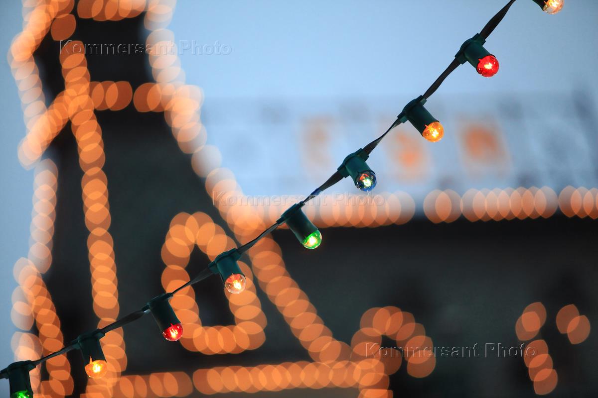 Жанровая фотография. Подготовка улиц к новому году. Елочные украшения на елке.