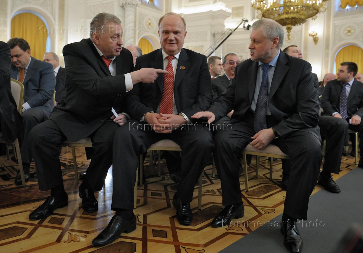 Слева направо: лидер Либерально-демократической партии России (ЛДПР) Владимир Жириновский, лидер Коммунистической партии России (КПРФ) Геннадий Зюганов и лидер партии "Справедливая Россия" Сергей Миронов перед началом ежегодного послания президента России Дмитрия Медведева Федеральному собранию.