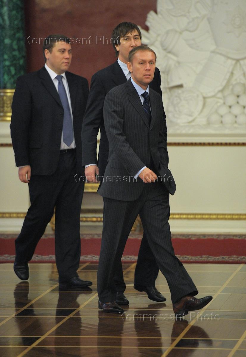 Губернатор Пензенской области Василий Бочкарев (слева) и член комитета Государственной думы России по жилищной политике и жилищно-коммунальному хозяйству Николай Валуев (в центре) перед началом ежегодного послания президента России Дмитрия Медведева Федеральному собранию.
