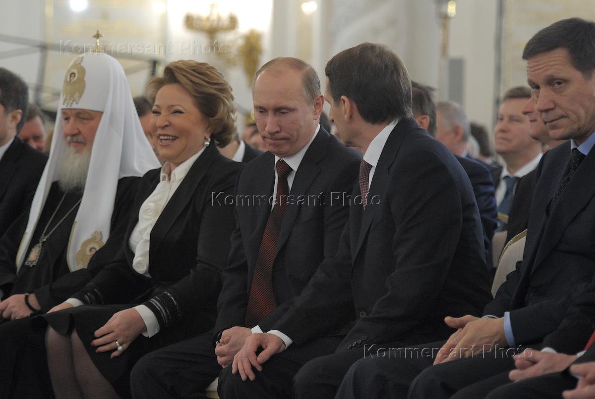 Слева направо: патриарх Московский и Всея Руси Кирилл, председатель Совета Федерации России Валентина Матвиенко, председатель правительства России Владимир Путин, председатель Государственной думы (ГД) России Сергей Нарышкин и первый заместитель председателя ГД России Александр Жуков перед началом ежегодного послания президента России Дмитрия Медведева Федеральному собранию.