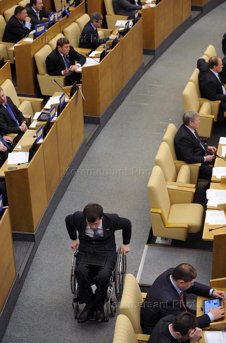Member of the State Duma Committee on security and anti-corruption Gennady Gudkov (left) and member of the Duma Committee on Physical Culture, Sport and Youth Affairs Dmitry Gudkov (right) at the plenary session of the State Duma of Russia.
