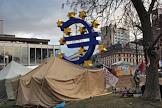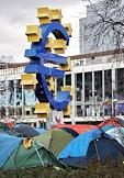 Виды Франкфурта-на-Майне. Палаточный лагерь движения "Захвати Уолл-стрит" в сквере у здания Европейского Центробанка. Символ евро.