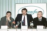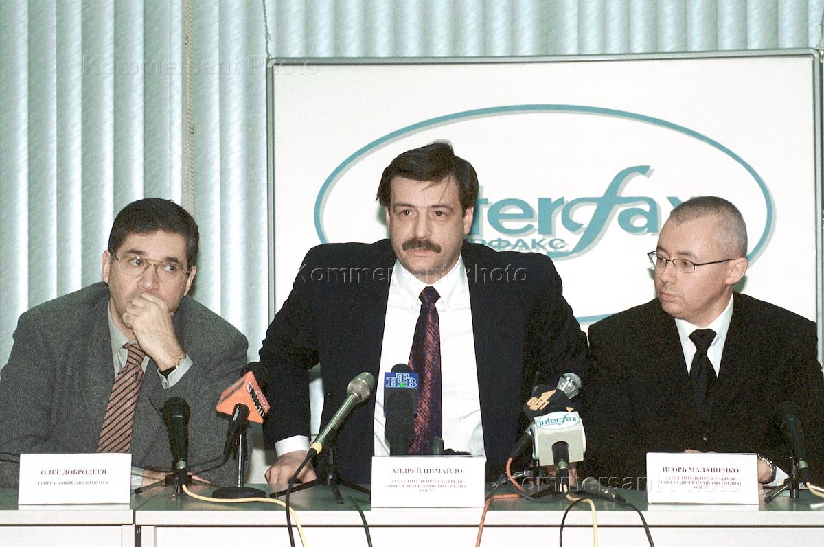Слева направо: генеральный директор телеканала "НТВ" Олег Добродеев, член Совета директоров холдинга "Медиа-Мост" Александр Цимайло(в центре) и заместитель главы холдинга Игорь Малашенко во время пресс-конференции в агентстве "Интерфакс".