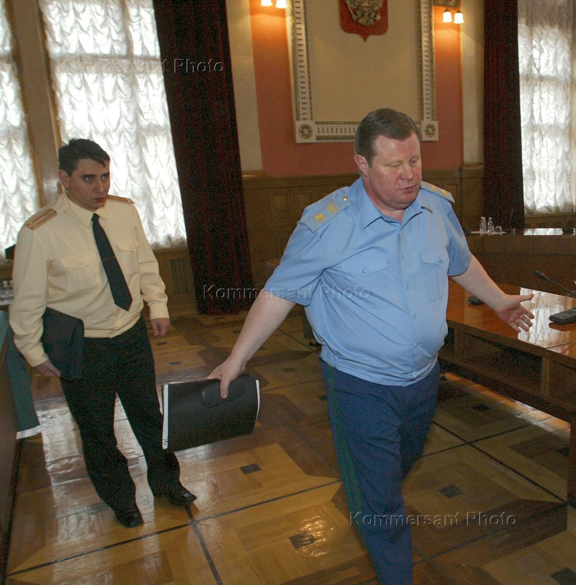Russian Prosecutor General Vladimir Ustinov (right) arrives at a press briefing held in the General Prosecution (Genprokuratura) office.