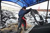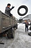 Разгрузка покрышек на территории завода по переработке использованных покрышек ОАО "Чеховский регенератный завод".