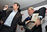 Шеф-повар ресторана Aromi la Bottega Пьетро Ронгони (слева) и журналист Леонид Парфенов (справа) на церемонии вручения премии Italian Cuisine Worldwide Awards (с этого года - Grano Padano Italian Cuisine Worldwide Awards). Церемония прошла в рамках празднования V Международного дня итальянской кухни в Москве в ресторане Aromi la Bottega.