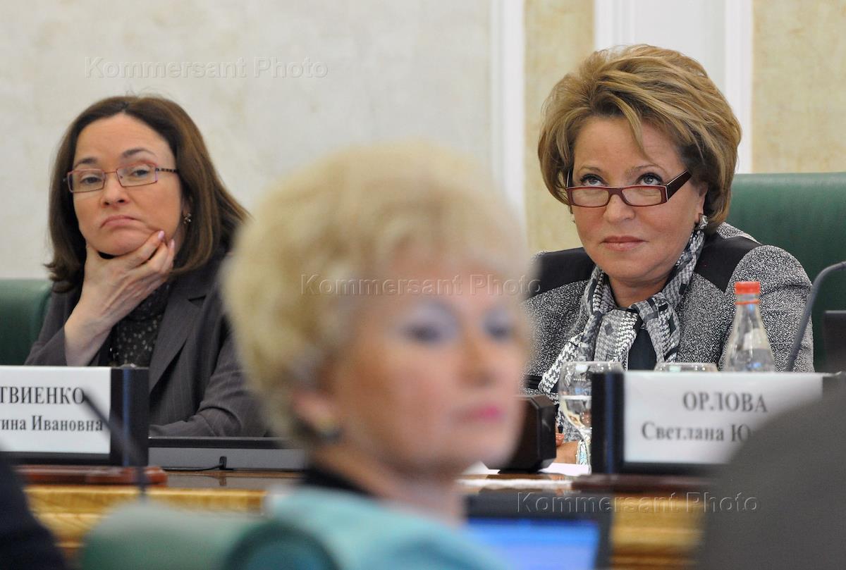 Слева направо: председатель Совета Федерации России Валентина Матвиенко, представитель от исполнительного органа государственной власти Брянской области в Совете Федерации России Людмила Нарусова и министр экономического развития России Эльвира Набиуллина во время совещания "О работе над проектом ФЗ. О федеральной контрактной системе в сфере закупок товаров, работ и услуг". Совещание прошло в Совете Федерации России.