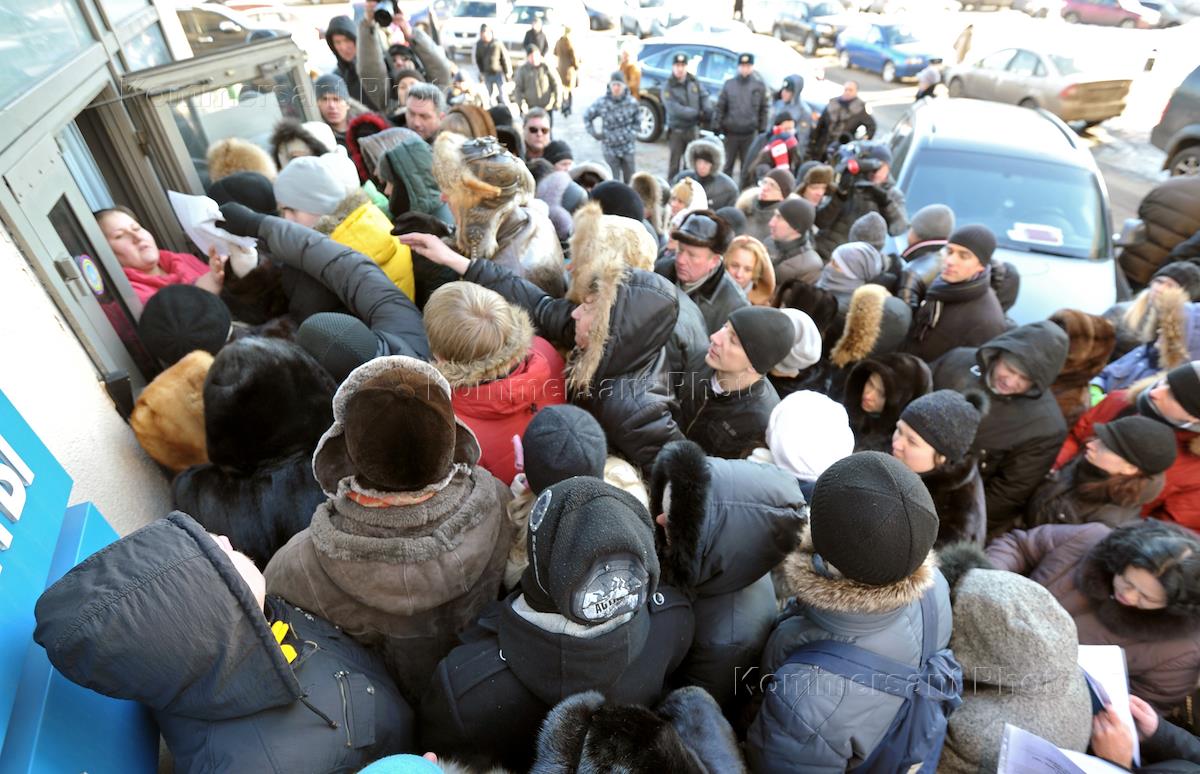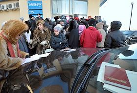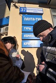 Пострадавшие клиенты у входа в офис туристической компании "Ланта-тур вояж", которая объявила о приостановке своей деятельности.