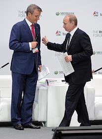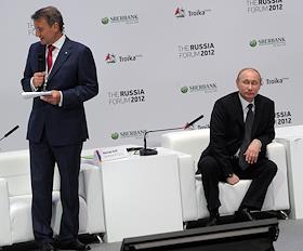 Председатель правительства России Владимир Путин (слева) и президент, председатель правления Сбербанка России Герман Греф (справа) во время инвестиционного форума "Россия 2012". Форум прошел в Московском международном доме музыки.