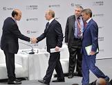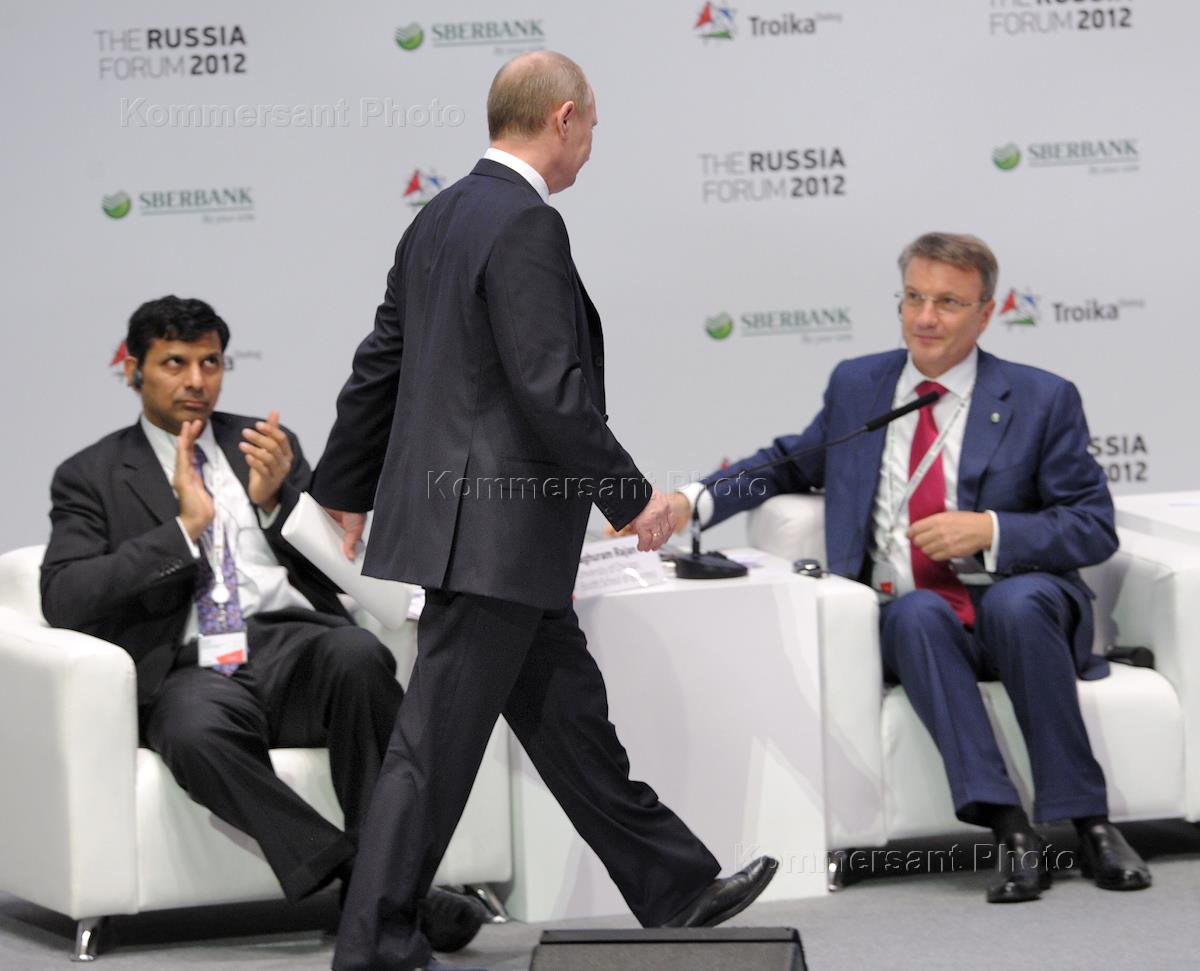 Слева направо: профессор Booth School of Business Чикагского университета Рагурам Раджан, председатель правительства России Владимир Путин и президент, председатель правления Сбербанка России Герман Греф во время инвестиционного форума "Россия 2012". Форум прошел в Московском международном доме музыки.