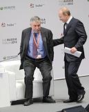 Профессор Пристонского университета Пол Кругман (слева) и председатель правительства России Владимир Путин (справа) во время инвестиционного форума "Россия 2012". Форум прошел в Московском международном доме музыки.