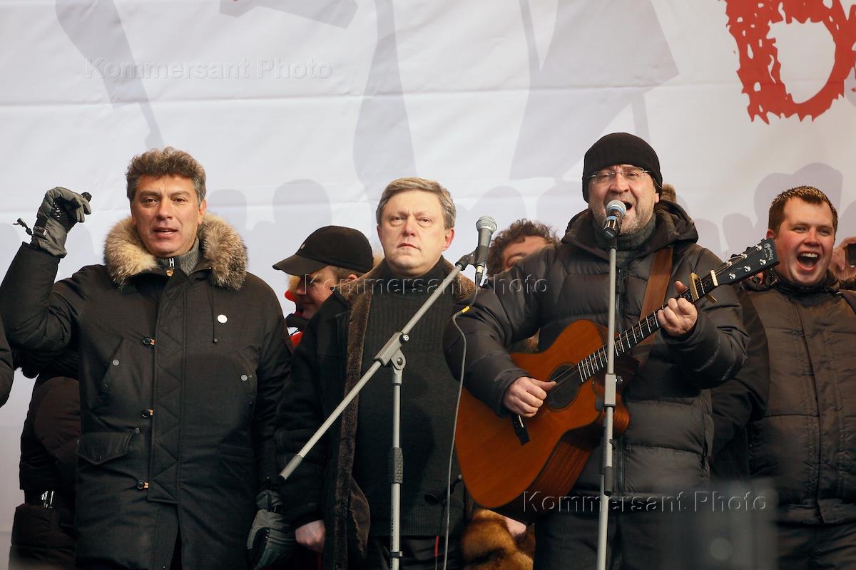 Слева направо: сопредседатель оппозиционной Партии народной свободы (ПАРНАС) Борис Немцов, лидер фракции "Яблоко" в Законодательном собрании Санкт-Петербурга Григорий Явлинский и музыкант Юрий Шевчук во время акции "За честные выборы". Акция прошла в форме шествия от Калужской площади по улице Большая Якиманка до Болотной площади.