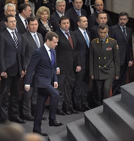 Президент России Дмитрий Медведев (слева) и министр внутренних дел (МВД) России Рашид Нургалиев (справа) во время заседания расширенной коллегии МВД России.
