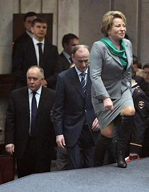 Заседание расширенной коллегии Министерства внутренних дел России. Слева направо: директор Федеральной службы России по наркоконтролю Виктор Иванов, директор Службы внешней разведки России Михаил Фрадков, секретарь Совета безопасности России Николай Патрушев и председатель Совета Федерации России Валентина Матвиенко во время заседания.