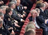 Министр обороны России Анатолий Сердюков (в центре) и директор Службы внешней разведки России Михаил Фрадков (справа) во время заседания расширенной коллегии Министерства внутренних дел России.