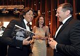 Телеведущий Андрей Малахов (слева) и первый вице-президент ОАО "Газпромбанк" Михаил Гришанков (справа) с супругой (в центре) во время "Сердечного приема" от Благотворительного фонда "Обнаженные сердца" Натальи Водяновой, который прошел в Концертном зале "Барвиха Luxury Village".