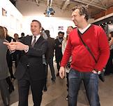 Президент BMW Group Russia Петер Кроншнабель (слева) и фотограф Влад Локтев (справа) во время приема по случаю открытия выставки "BMW. История победитлей" и презентации нового BMW третьей серии в выставочном центре "Бахметьевский гараж".