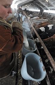 Сотрудница животноводческого комплекса ООО «Фаворит» наливает молоко телятам.