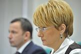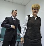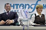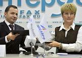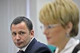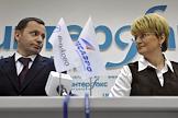 Директор ОАО "Авиационная компани "Трансаэро" Ольга Плешакова (слева) и председатель совета директоров ОАО "Международный аэропорт "Внуково" Виталий Ванцев (справа) во время пресс-конференции на тему: "Начало сотрудничества аэропорта "Внуково" и авиакомпании "Трансаэро". Новые возможности для пассажиров в 2012 году." Пресс-конференция прошла в центральном офисе агентства "Интерфакс".